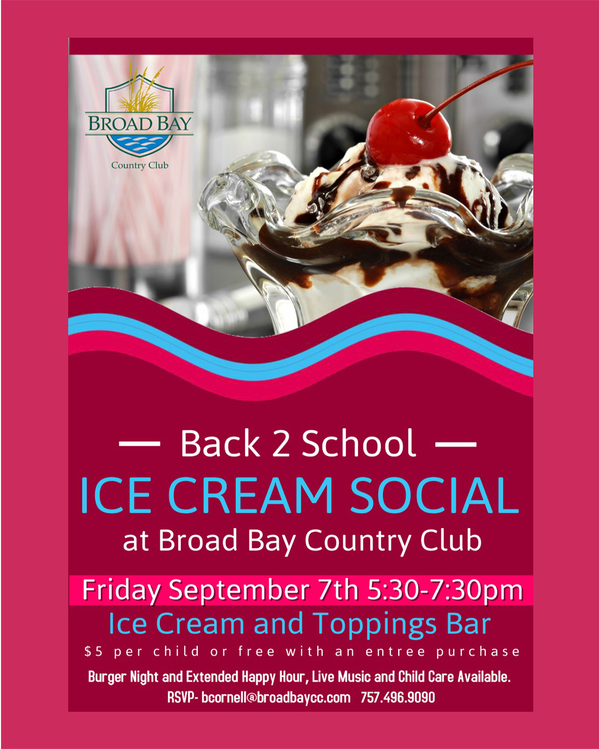 Visit Broad Bay Friday September 7th from 5:30pm to 7:30pm for the Back 2 School Ice Cream Social. In addition to the normally scheduled Friday Night Live, Burger Night and Extended Happy Hour, Broad Bay will be offering a special Ice Cream and Toppings Bar. Kids who dine with us Friday, eat Free Ice Cream. If you're not hungry for dinner just Ice Cream, the Ice Cream Bar is only $5.